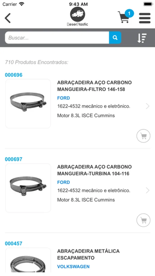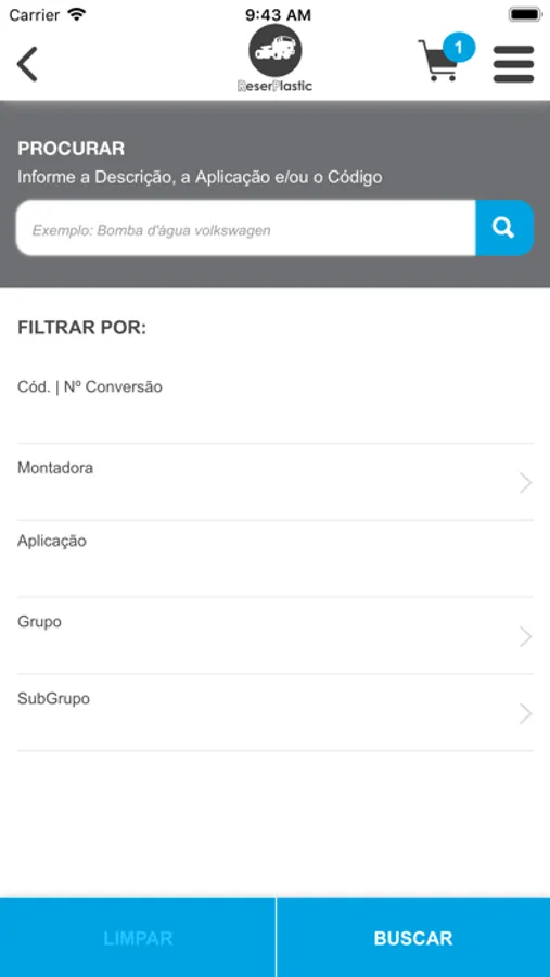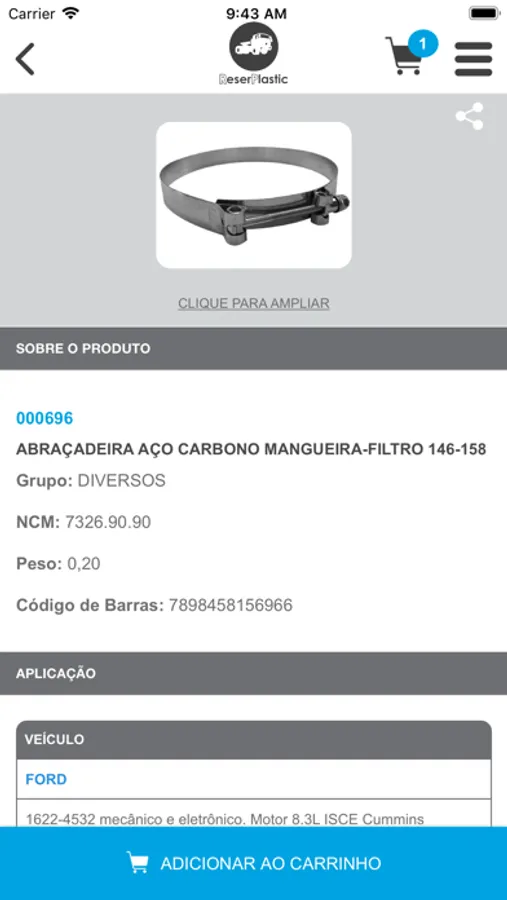 "Catálogo em forma de aplicativo que permite a consulta das peças fornecidas pelo fabricante ReserPlastic através do seu código de identificação, código original ou aplicação. Neste cnsulta é possível visualizar a foto da peça e outros dados como peso, NCM e código de barras.