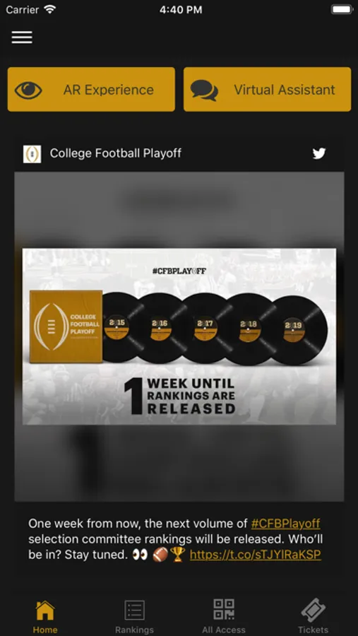 The College Football Playoff is the postseason format that determines the national champion for FBS college football. The playoff was created to preserve the excitement and significance of college football’s unique regular season where every game counts. Follow the excitement by downloading CFBPlayoff, the official app of the College Football Playoff.
