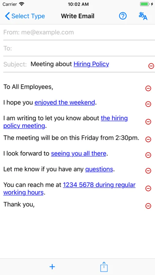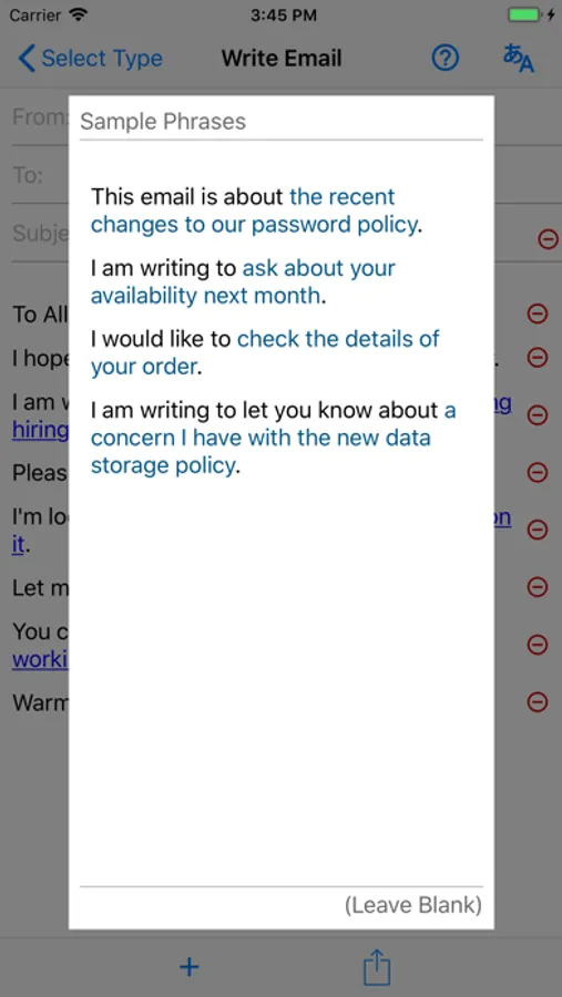 Choose from over 100 sample sentences to complete a template, then edit the details