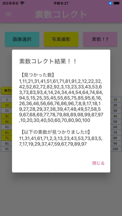 写真を撮ると自動で画像内の素数を抽出し、素数図鑑に登録します。