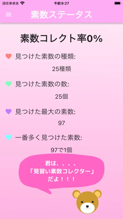素数図鑑にて集めた個数や、その素数の生息地を確認できます。