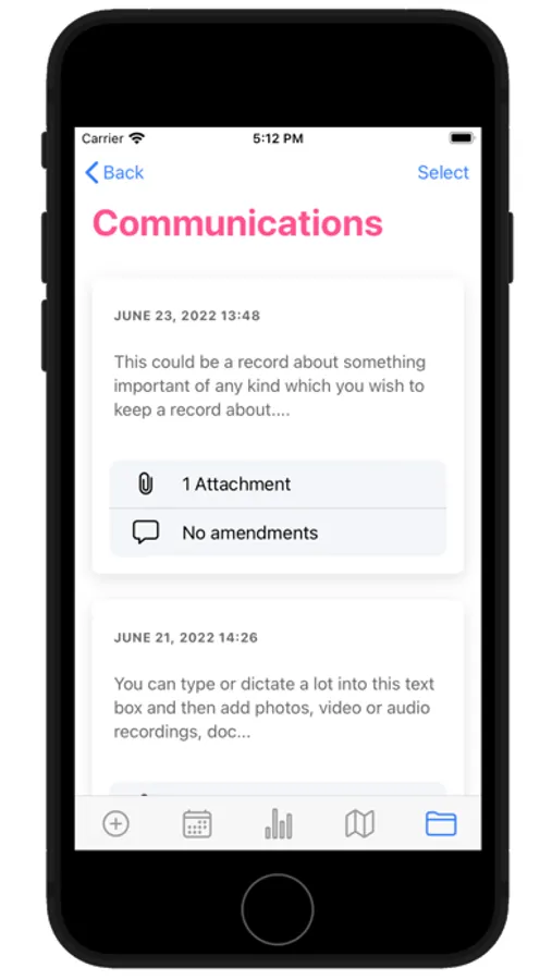 To prove that your records are true, you can show when and where your evidence was saved and rely on the integrity of uploaded photographs and other attachments to use them as evidence (only if photos are taken using the app can you prove you have not used editing software). Your records are automatically sorted into a date/time timeline and attachments are clearly linked to the record they relate to.