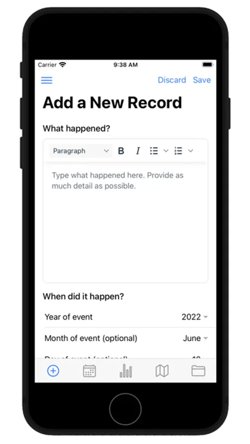 With both the free and subscription service, ONRECORD allows you to combine your record of what has happened with supporting evidence such as time/date stamps, photos, screenshots, video or audio recordings, documents, and location data.