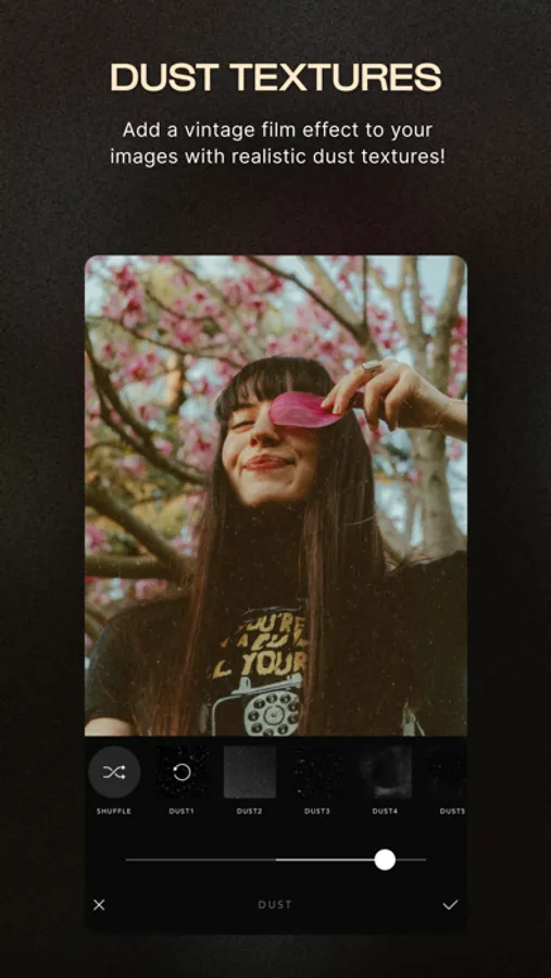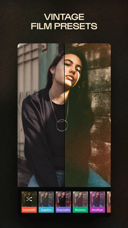 Experiment with a selection of one tap Film Presets inspired by real film shoots. Simply tap for a full Preset edit, and tap again for randomized effects, including genuine Light Leaks, Dust textures, and more.