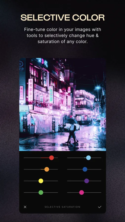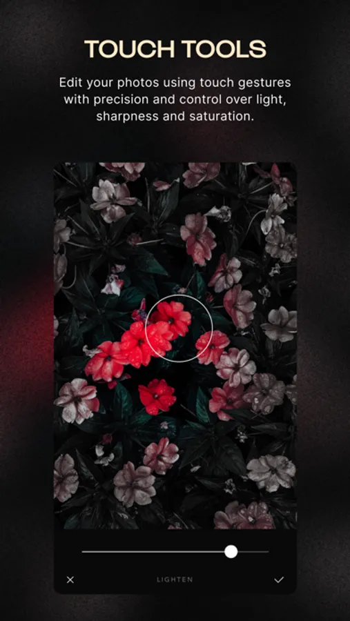 Tweak your photos to perfection and with precision using our enhanced Adjustment Tools controlled by Touch Gestures, as well as Advanced Curves, Selective Hue / Saturation / Lightness, Overlays / Gradients, Grain and many more.