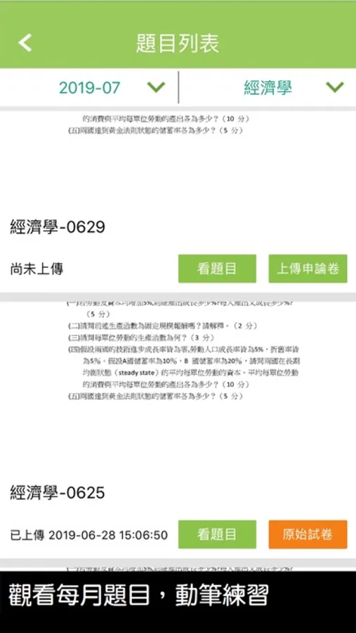 1.點選「看題目&上傳」按鈕,選擇月份與科目,即會顯示該月申論練習題目,並使用專屬申論紙作答。