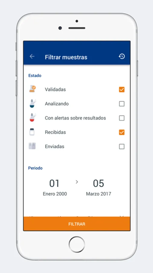 Muestra. Eurofins | IPROMA analiza la muestra en su laboratorio e informa en tiempo real a través de la app de su estado con todos los datos: recibida, analizando o validada.