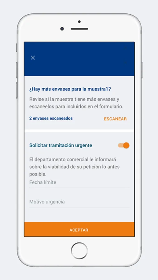 Envase. El cliente realiza un pedido de un envase e Iproma se lo hace llegar con un código QR, que se escanea con el móvil para hacer el seguimiento de la muestra.
