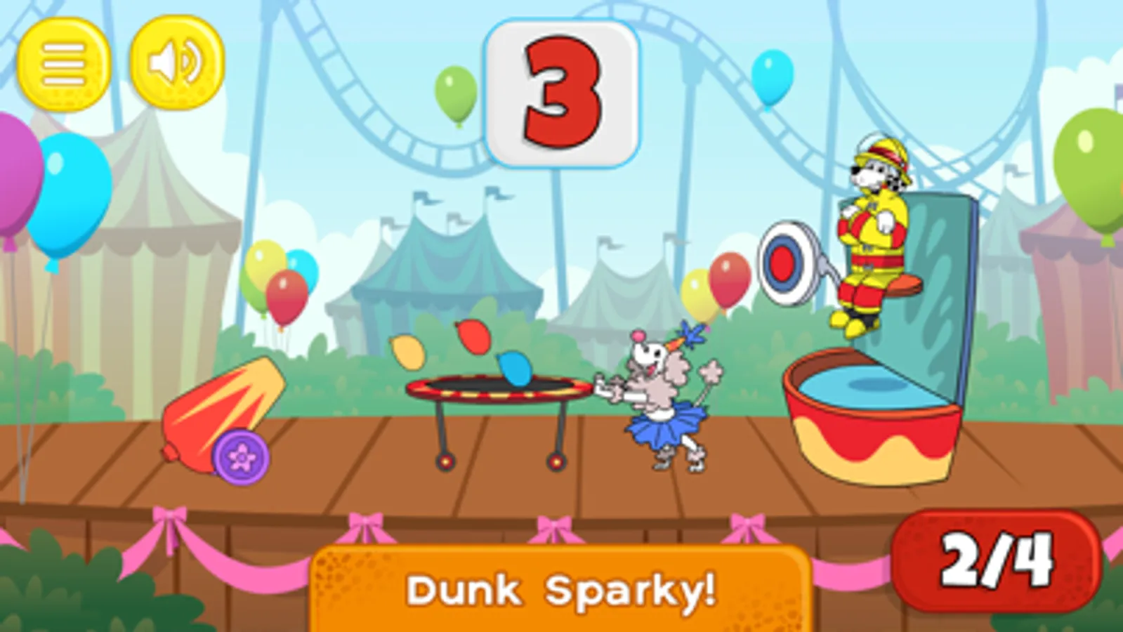 Once you help Sparky get outside safely, you'll unlock three fun mini-games. Toss balloons to dunk Sparky in the dunk tank, solve addition facts to squirt robots with water and send Sparky on a roller coaster ride by spelling words correctly!