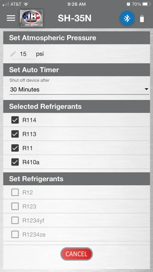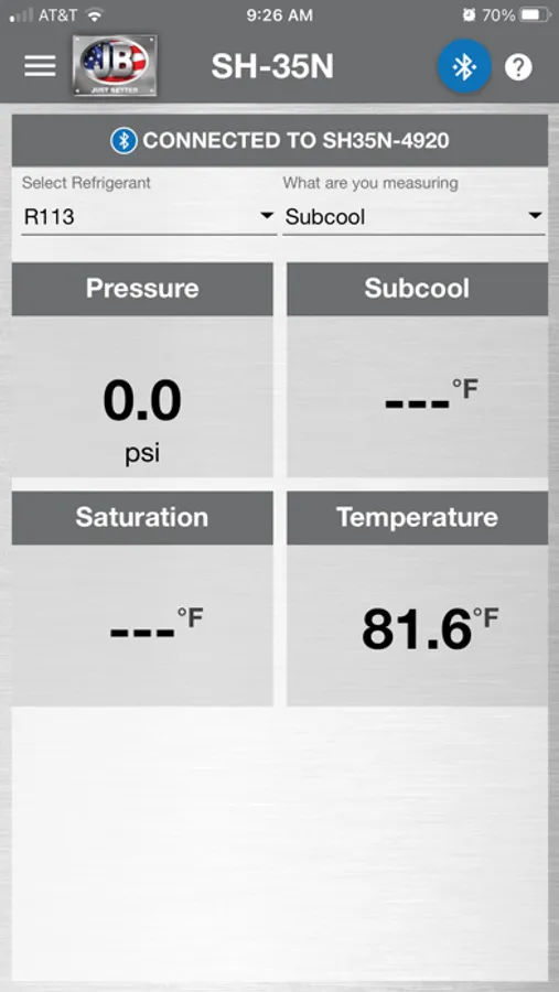 Wireless pressure temperature gauge from JB Industries. Allows measurement of pressure, temperature, saturation temperature, superheat, and subcool. The app allows the user to program up to 5 favorite refrigerants into the device and update the firmware. The app allows system monitoring all from one screen.