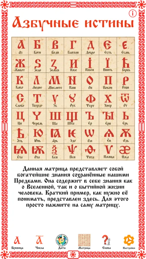 В данном приложении представлено только Буквица, но в ней сокрыто намного больше, чем кажется на первый взгляд. Изучив её можно начать ПОНИМАТЬ русский язык!!!