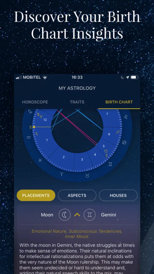 * Discover your Birth Chart’s Placements, Houses, Aspects and see it visualized…Read your Birth Chart insights & how they influence you.