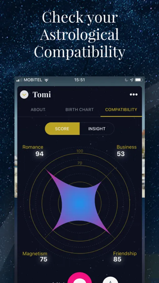* Get valuable insights into the strengths of your Birth Chart compatibility with new people you discover or already know. Check your Synastry scores for Romance, Friendship, Magnetism (Chemistry) & Business.