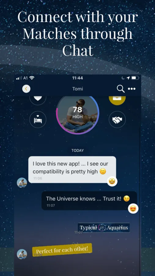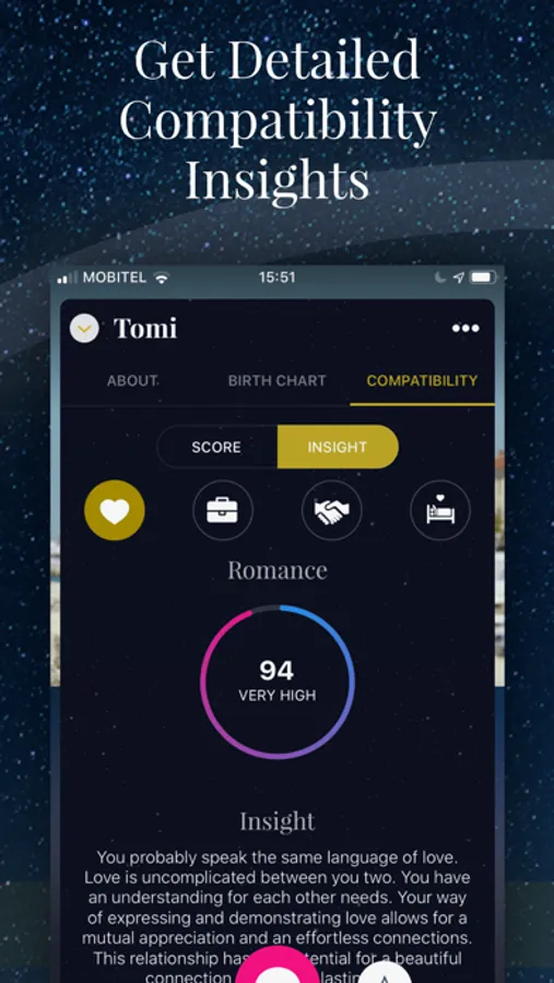 Before initiating a Connection, NUiTers are provided with Compatibility Scores and Insights for every Profile, directly calculated from the two Individuals' Birth Charts and how they relate to one another.