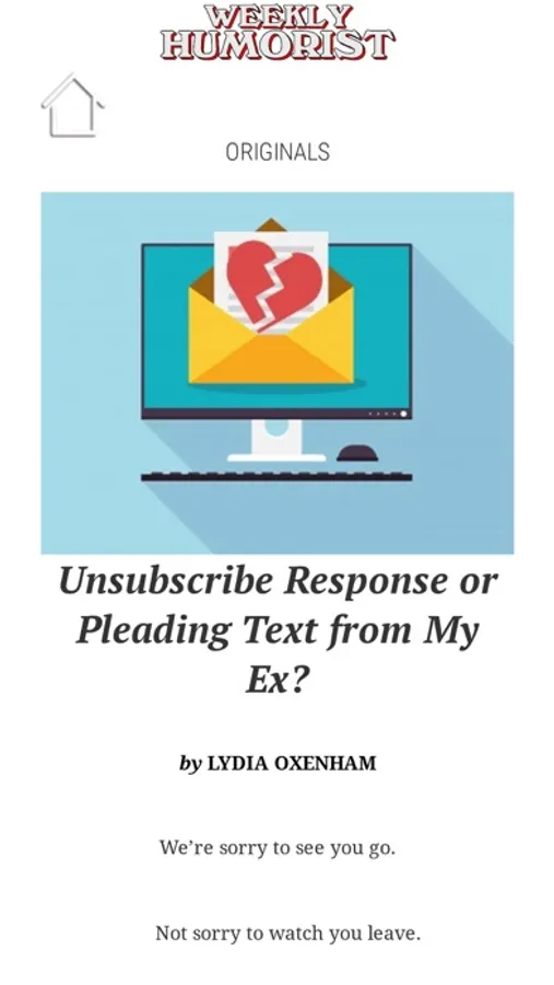 Payment will be charged to your Account at confirmation of purchase. Subscription automatically renews unless auto-renew is turned off at least 24-hours before the end of the current period. Account will be charged for renewal within 24-hours prior to the end of the current period, and identify the cost of the renewal. Subscriptions may be managed by you and auto-renewal may be turned off by going to your user's Account Settings after purchase. No cancellation of the current subscription is allowed during active subscription period. Any unused portion of a free trial period, if offered, will be forfeited when you purchase a subscription to Weekly Humorist.