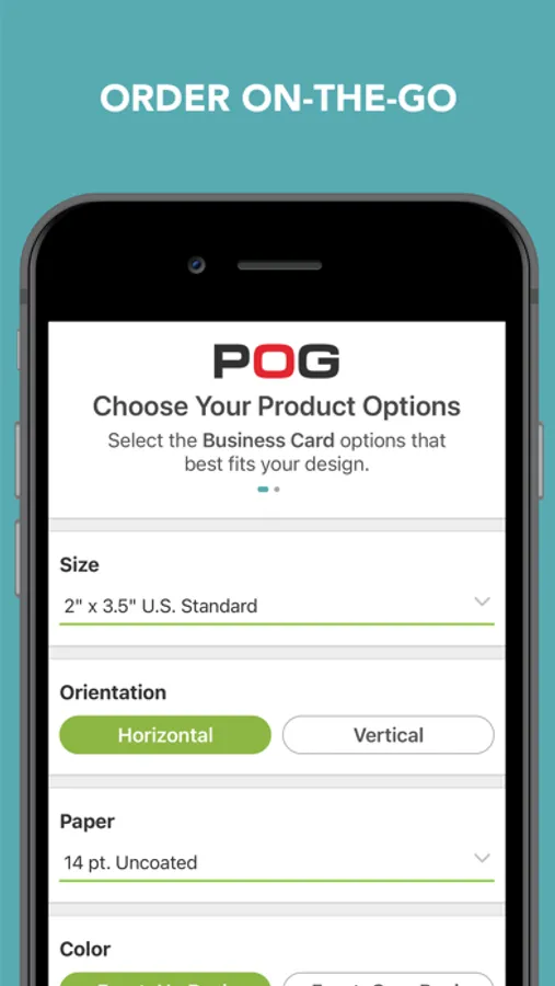 Simply pick your product, tap to choose your orientation, swipe to see every available size, select your paper stock while comparing prices, and upload your design in a matter of seconds.