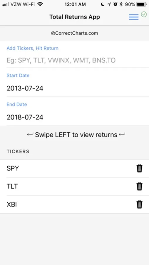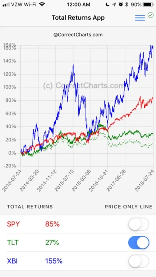 -You can input multiple securities at the same time to see cumulative return charts and associated return numbers. You have the option to see charts inclusive or exclusive of dividends and interest (Total return or Price return). Just three screens and a few taps. Done!
