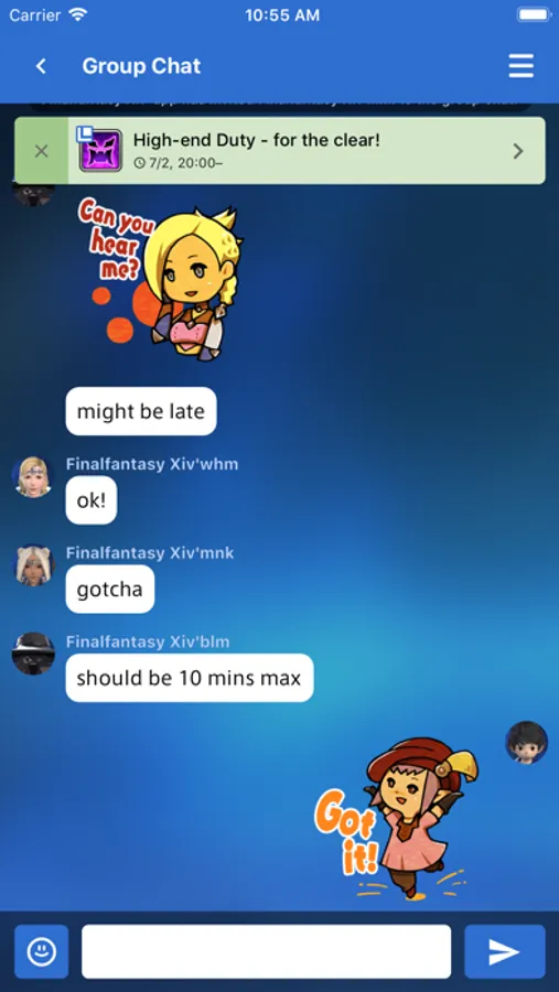 Chat with other players who are using the companion app; your in-game friends, Free Company and Linkshell members, and more!