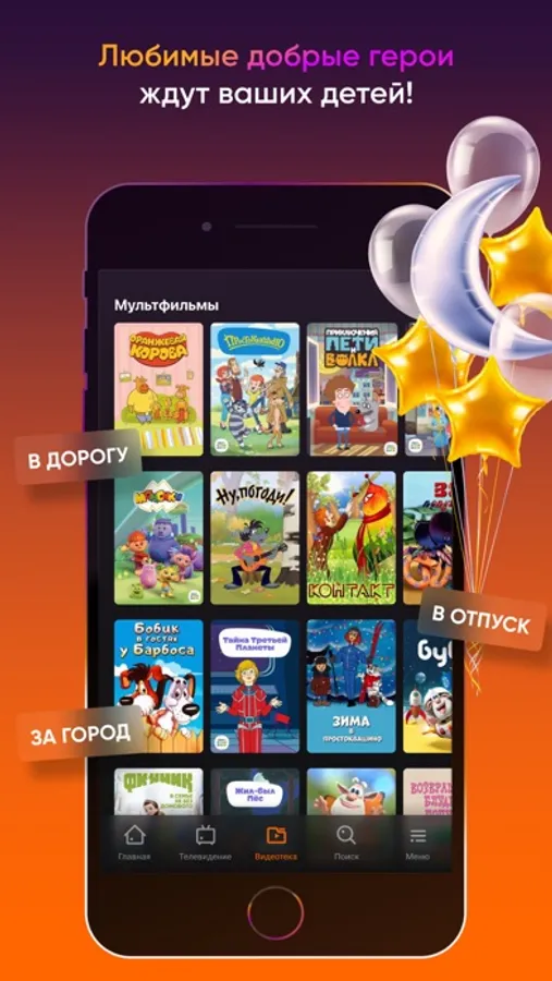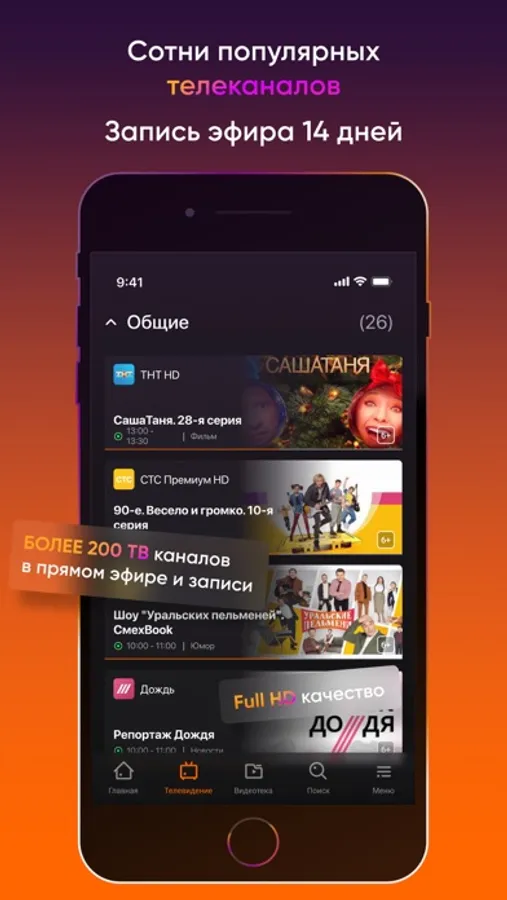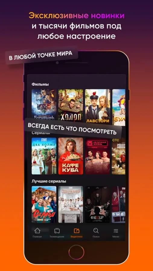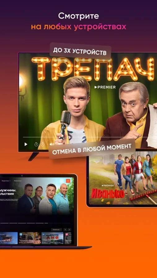 - Смотрите на любом устройстве: смартфоне, телевизоре, планшете.