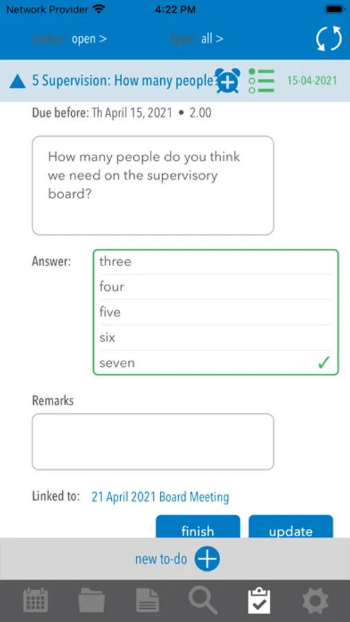 Have more control over meeting results. Check the status of action items whenever you want. Edit the agenda structure right until the last minute. Shorten the meeting time by asking questions to the participants per agenda item before the meeting. All decisions and the complete archive are always available to you.