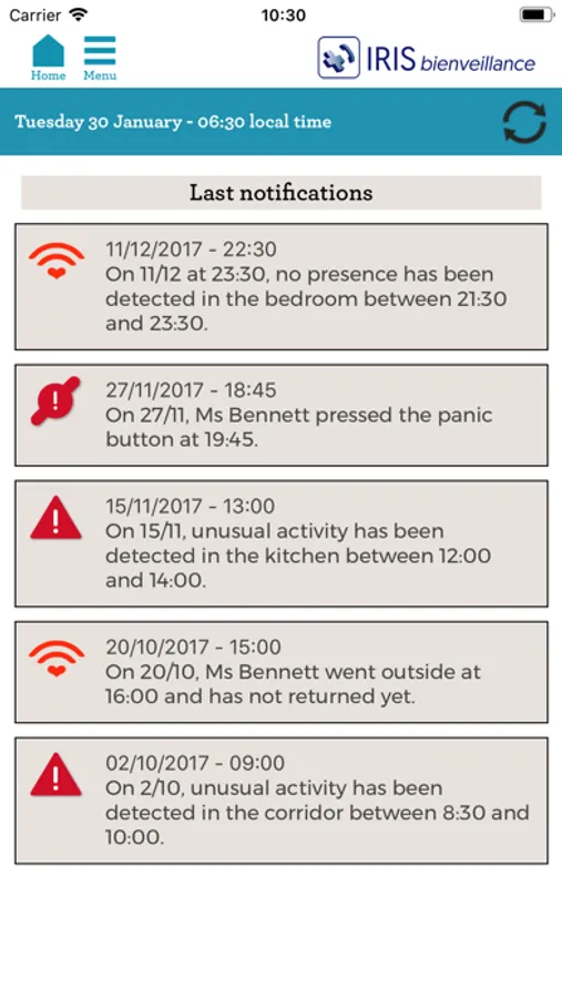 - IRIS BIENVEILLANCE provides access at any time to the last notifications sent.