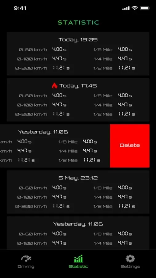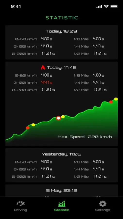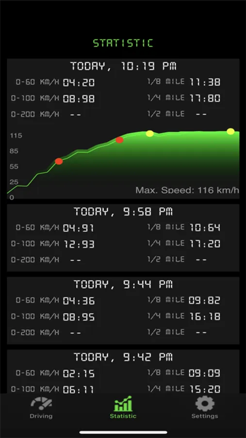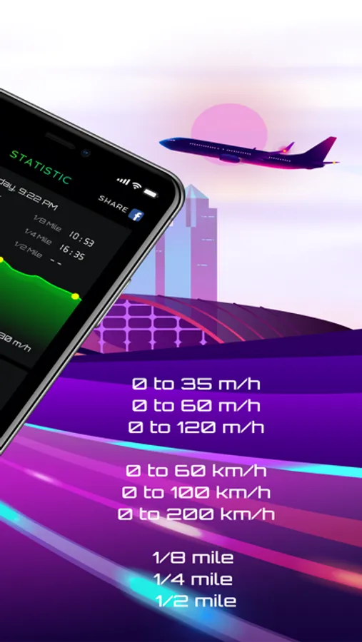or car acceleration from 0 to 60, 100 and 200 km/h (35, 60 and 120 mp/h) stopwatching for distance to overcoming 1/8, 1/4 and 1/2 of mile.
