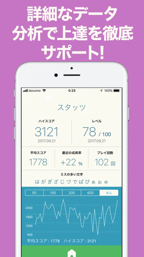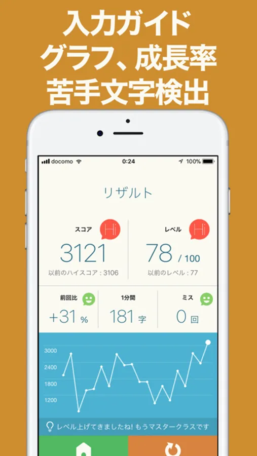 初心者に親切な入力ガイド、折線グラフ、成長率、苦手文字検出など多彩なサポート機能で上達を加速させましょう!