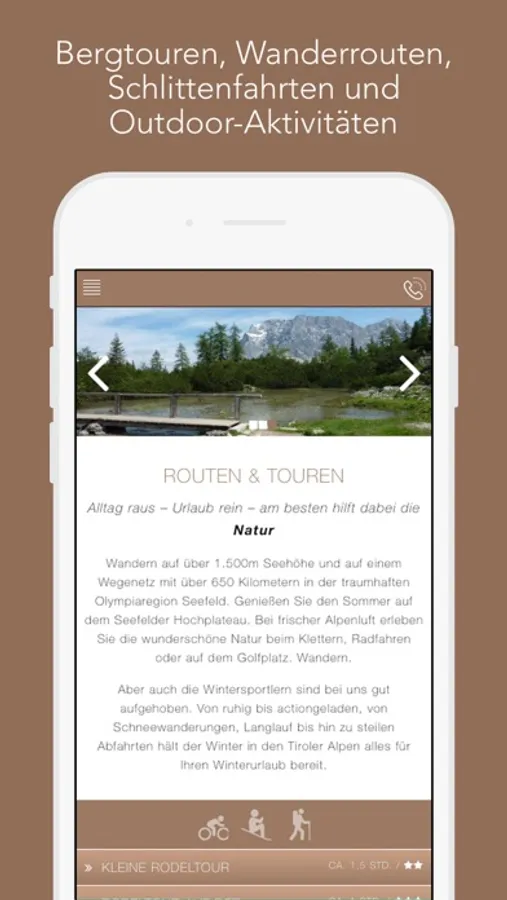 Die App beinhaltet neben Informationen zu Wanderungen, Rad- und Bergtouren in der Region, auch Wissenswertes rund um das Wellnesshotel Schönruh und unser Schwersterhotel Haus Stefanie. Auf diese Weise sorgt die App für einen unvergesslichen Wellnessurlaub in Seefeld.