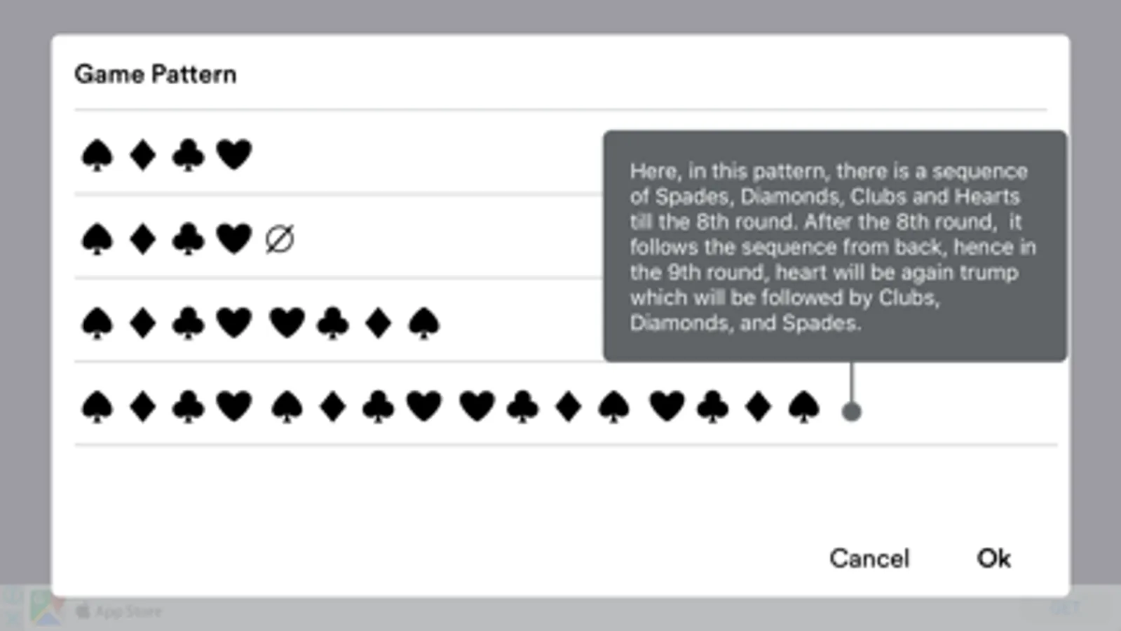 User have to add the number of players and their name for playing. They can also arrange the sequence of Users as well. On click of Start Game button one dialog is shown to the user which consists current trump as per selected pattern and current hands game. User have to select plus or minus button hands for every player.On click of Ok button one round is add into dashboard