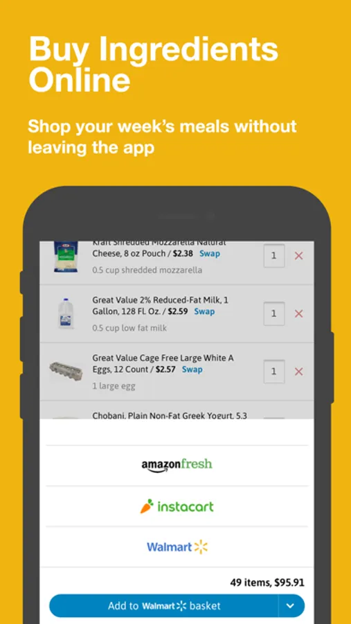 Shop your week's meals without leaving the app! Supports the following grocery services: AmazonFresh, Instacart & Walmart.