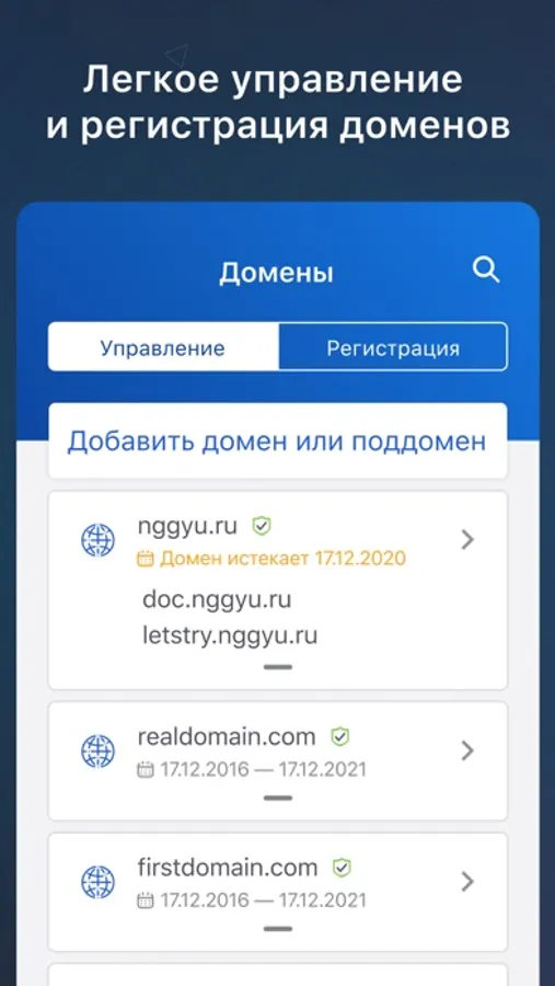 Через приложение доступна регистрация доменов, а также их продление и редактирование DNS-серверов. Кроме того можно создавать поддомены и управлять ими.