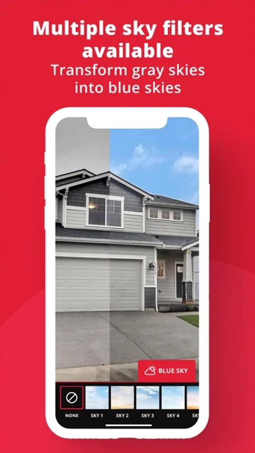 Shoot the outdoor of a property and use the Blue Sky feature that allows you to replace a gray sky with a beautiful blue sky. This process is done in a second, and gives you stunning results.