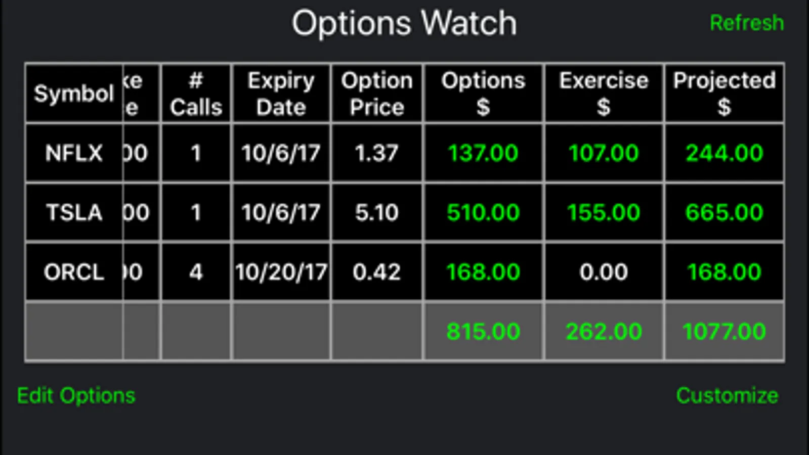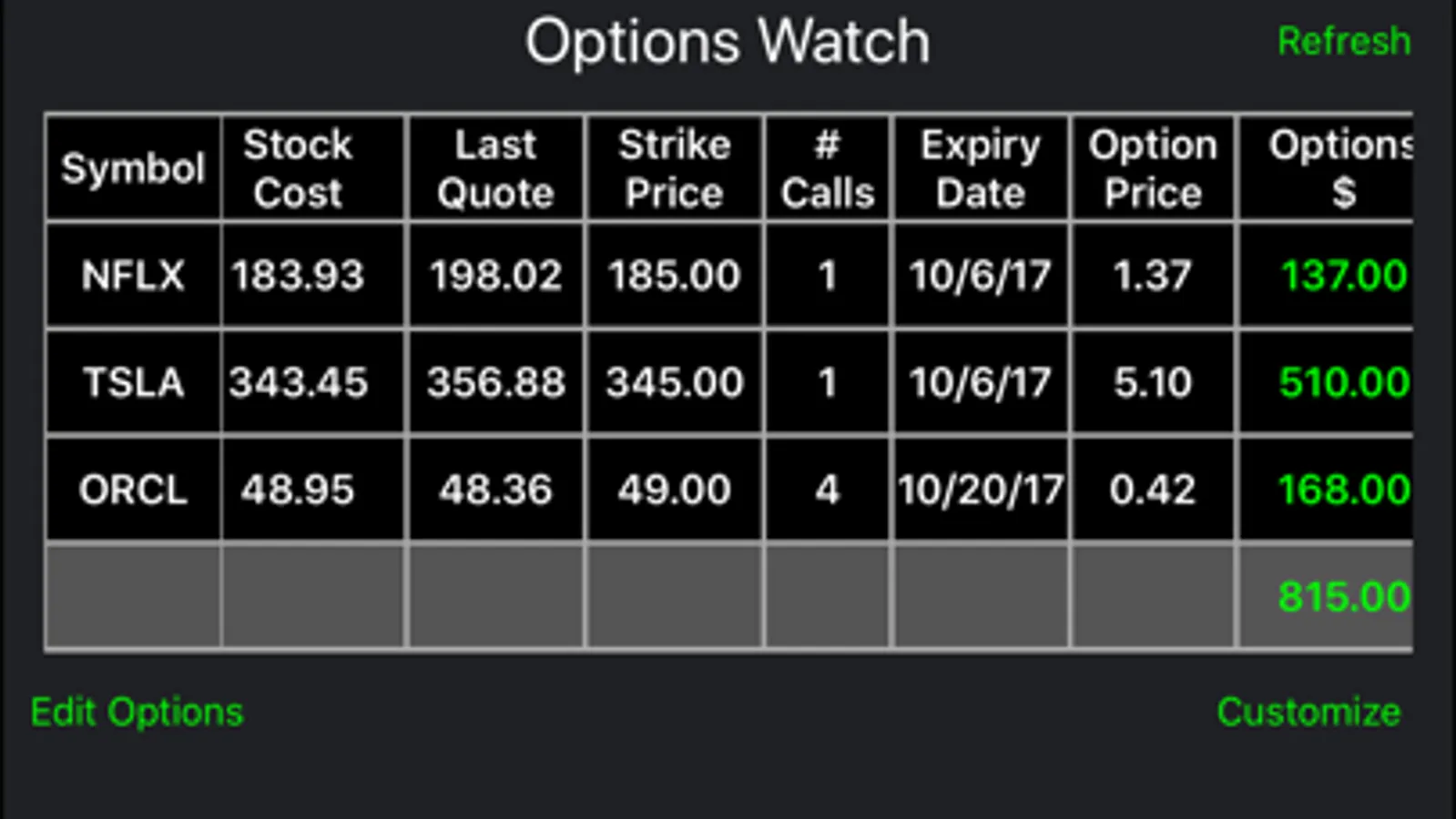 Options Watch allows you to watch up to 8 NYSE or NASDAQ call options. Based on the strike price for the option compared to the current* underlying stock’s price, you are able to project whether the option will be assigned or not. Calculations for profit made when the option was sold as well as profit on projected assignment are shown. Options expiring in the current week are highlighted. The options are shown in expiration date order.
