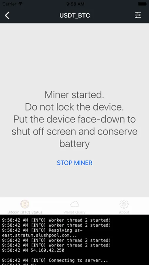 Explore the world of mining right on your iOS device. You don't need fancy expensive equipment to do mining. You already own a device powerful enough to mine. Bitcoin (BTC) normally needs specialized equipment called ASIC because mining bitcoin is getting harder and therefore specialized equipment is being built for this purpose. For normal casual people who just want to mine for fun this app is perfect. The app runs 4 worker threads to mine bitcoin blocks and you can view the apps logs as it works to find valid blocks.