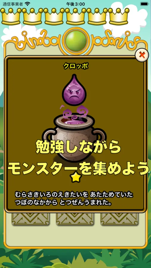4択のクイズ形式という使いやすさ、勉強のご褒美にモンスターを集めていく楽しさで、子供が継続的に勉強します。(iPad、iPhoneの両方に対応)