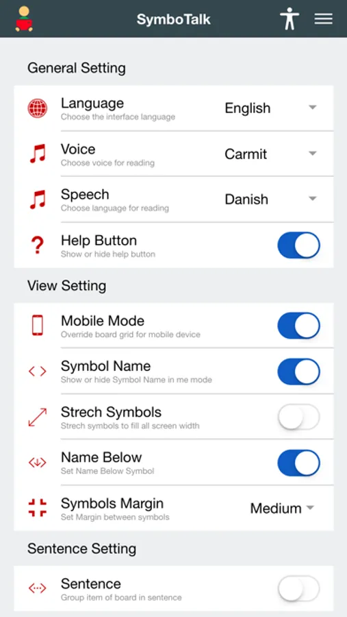 SymboTalk is an app that talks for you by clicking on symbols (images or icons). The app has predefined communication boards from different areas of life, each board contains symbols (images). Clicking on a symbol reads it aloud and adds it to a sentence which can also be read. This way SymboTalk can be your voice and talk for you.