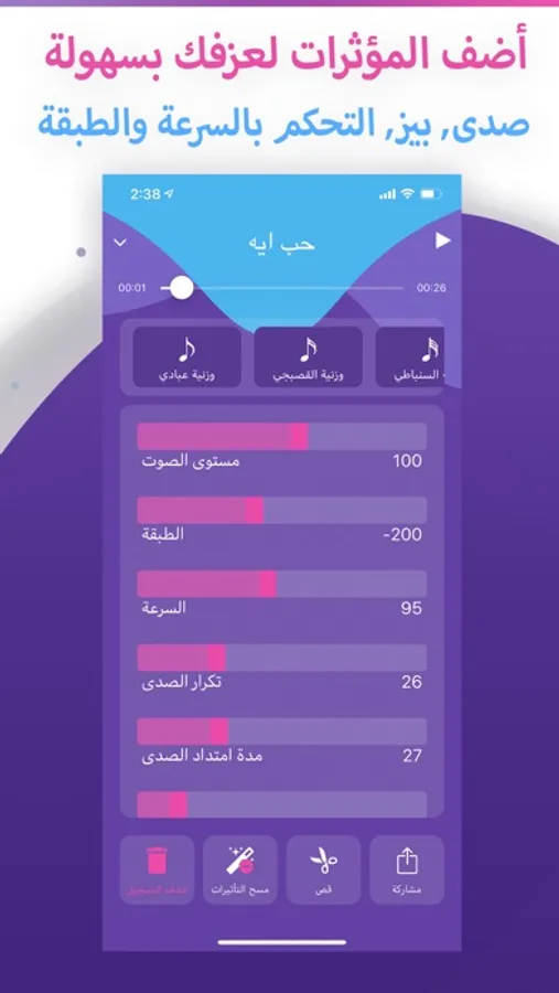 سجل عزفك مع الإيقاعات و أضف مؤثرات صوتية مثل الصدى وتحكم بالطبقة والسرعة