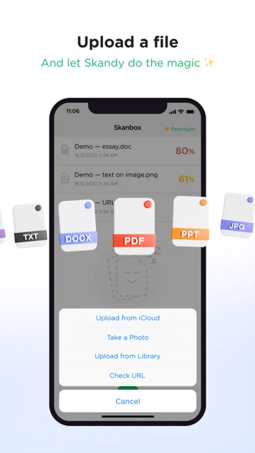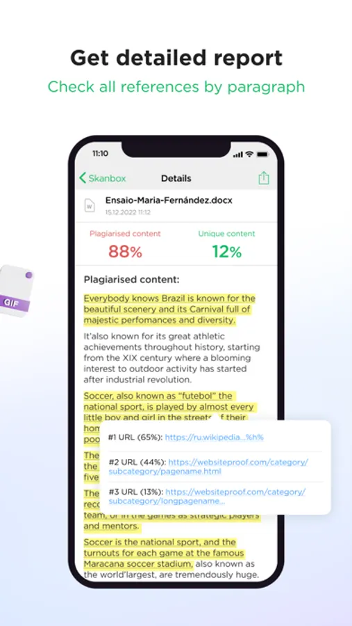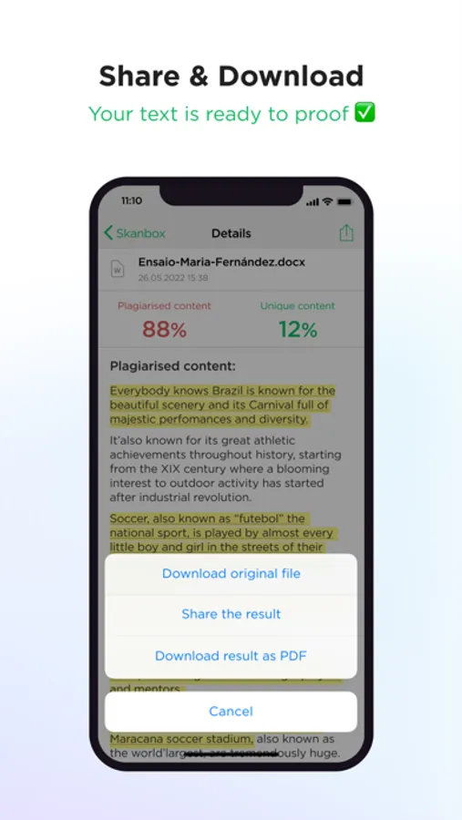 In Skandy, you can find some demo files without any contribution, registration, or ads. After uploading a file, Skandy checks it usually within seconds. Once finished, download the report in PDF or share it with others. Students can add their College and Student names to the report.
