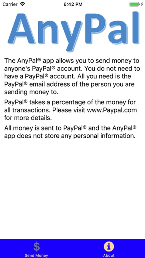 AnyPal allows non-PayPal users the ability send money to any PayPal account without having to sign up and be a member of PayPal. All you need is the PayPal account holder's email address and the money will transfer to them and you will enter in your email address on the PayPal screen and get an email confirming the money transfer.. AnyPal does not save any details nor take a percentage of any payment. This is a great way to add money to your own PayPal account, pay for rent, or for anything where you need to transfer money to a PayPal account without having to sign-up with PayPal.