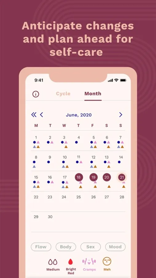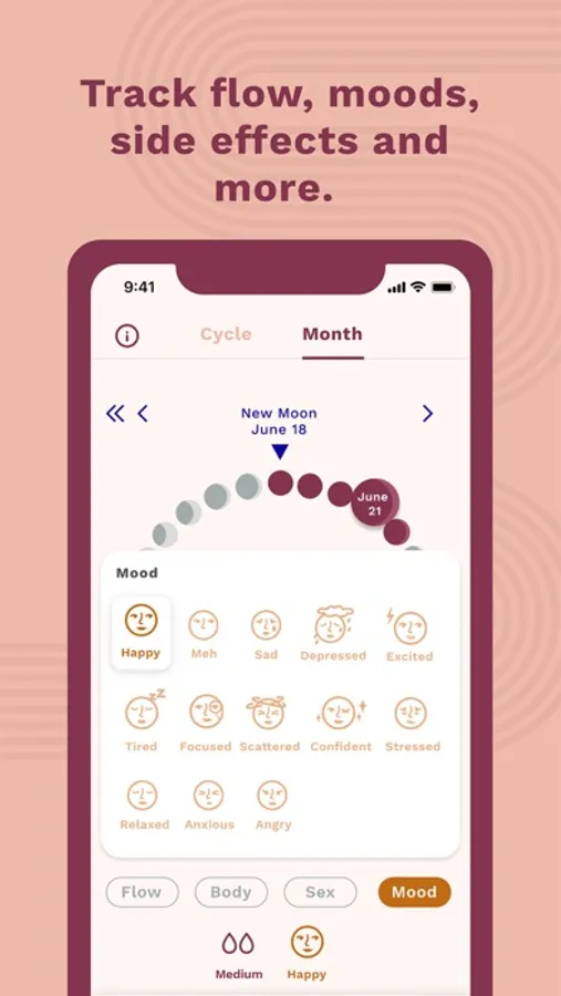 • Go beyond period tracking to monitor symptoms and experiences related to moods, body, and sex.