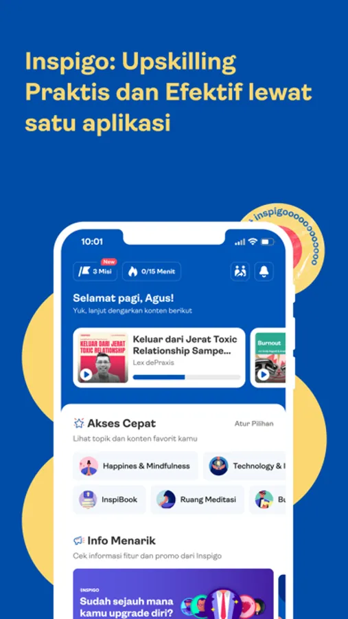 Make your day more productive with a practical, solid, and continuous learning experience with Inspigo! Enjoy knowledge and inspirations from anywhere and anytime with learning content in bite-sized audio format. Inspigo is perfect for busy young professionals who are always eager to learn new things and inspirations from the top experts in the industry.