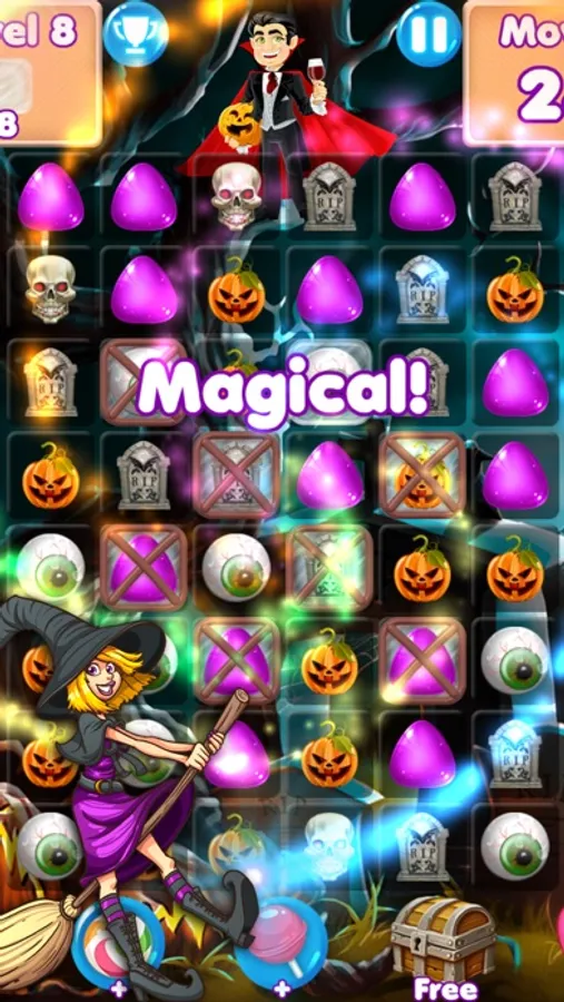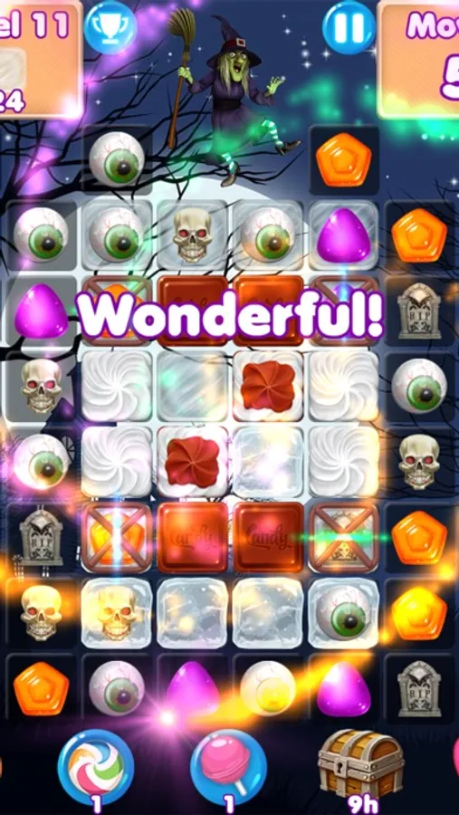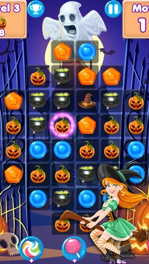 Halloween Treats & Candy Moves is a match 3 puzzle game where you can match and collect candies just for Halloween! Go on a candy collecting adventure with all the ghouls and ghosts! Challenging puzzles give you endless hours of amazing spooky fun!