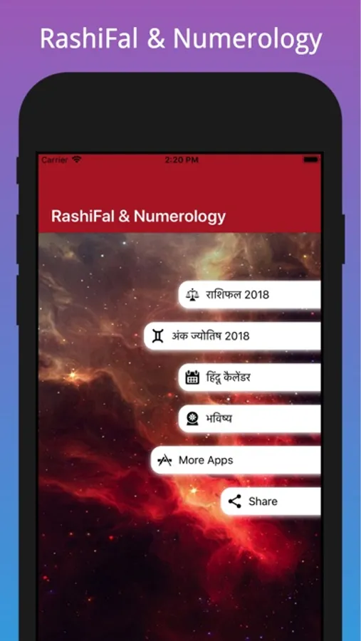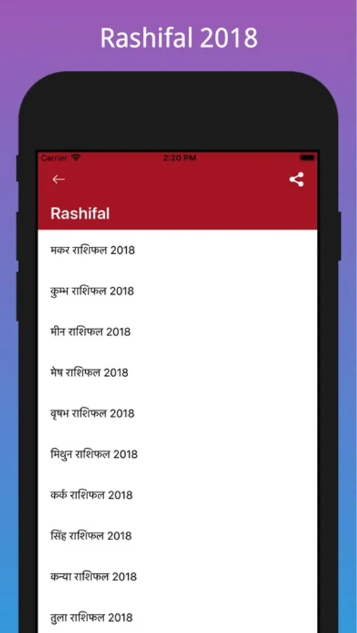 Mesh (Aries), Vrush (Taurus) , Mithun (Gemini) , Kark (Cork), Singh (Leo), Kanya (Virgo), Tula (Libro), Vrishichal (Scorpio), Dhanu (Saggitarius), Makar (Capricorn), Kumbh (Aquarius), Meen (Pisces) In Hindi Language Rashifal 2018 is an app which provides full Yearly Horoscope an easy way and you can also know many others interesting things about you and your life. This app is based on Indian Astrology, Predictions, Numerology, and Lalkitab rashifal for all Rashis in Hindi language.
