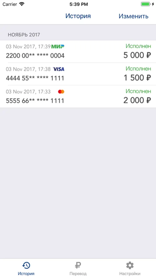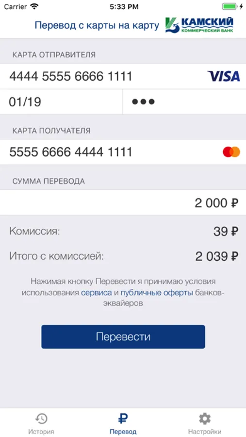 - Переводы осуществляются в рублях РФ, между картами выпущенными Российскими Банками