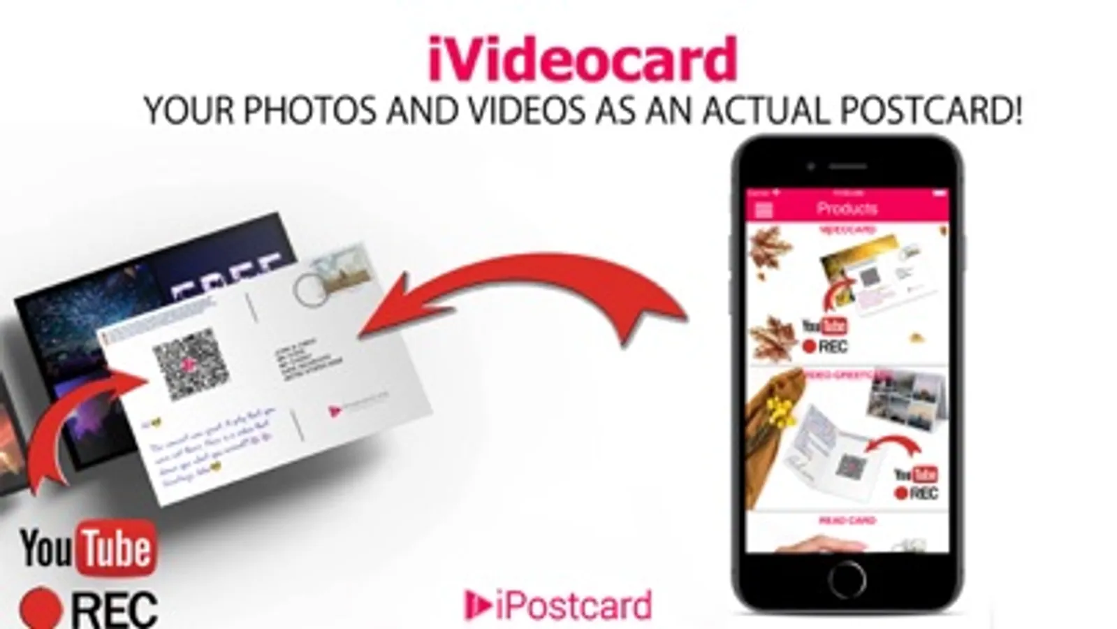 Thanks to iVideocard and iVideo-Greetcard you can record your own videos (30 sec.) or add any YouTube videos. The recipient may play the video using the iPostcard app.