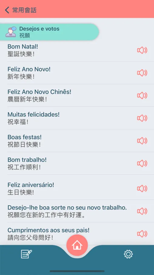 4. Communication: Users will find over 1,000 useful phrases and sentences in numerous real-life situations. The phrases are thematically grouped, and users can listen to the sentences read by native Portuguese speakers. It is also possible to compare the sentences with the Chinese translation (simplified or traditional).