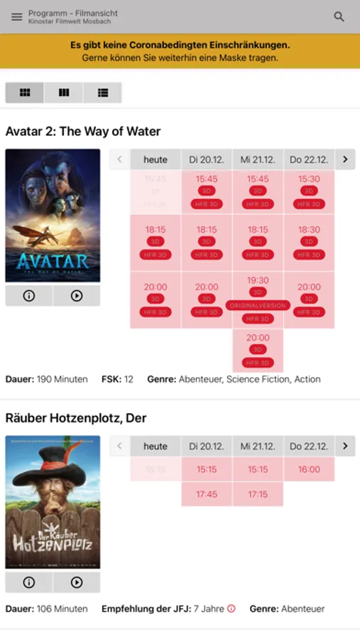 Hier kaufst Du in unter einer Minute Kinotickets für Deinen Lieblingsfilm. Schnell, sicher, einfach und ohne Anstehen an der Kinokasse. Einfach aus dem aktuellen Kinoprogramm Deinen Film buchen und Du erhältst die Tickets einfach & bequem als E-Ticket auf Dein Smartphone und an Deine E-Mail-Adresse.