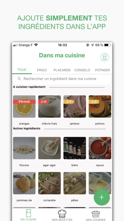Une fois les ingrédients validés dans ta liste de courses, ils s'ajoutent automatiquement dans ta cuisine virtuelle et s'ordonnent par ordre de priorité.