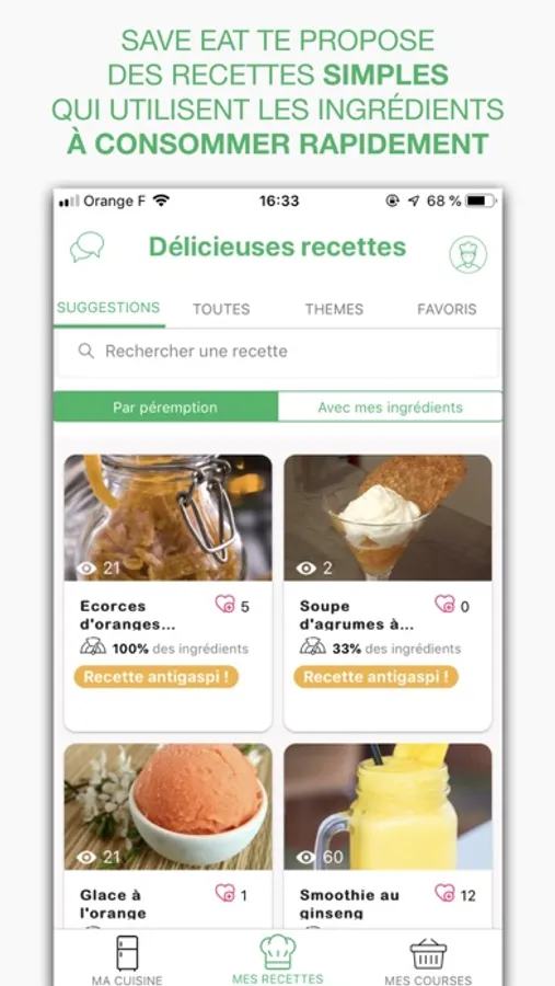 Choisis une des recettes suggérées par Save Eat pour utiliser les ingrédients de ta cuisine. Tu peux aussi choisir une recette parmi les nombreux thèmes disponibles : "un homme en cuisine", "apéro du vendredi", "soirée entre copines", à toi de choisir selon ton humeur.