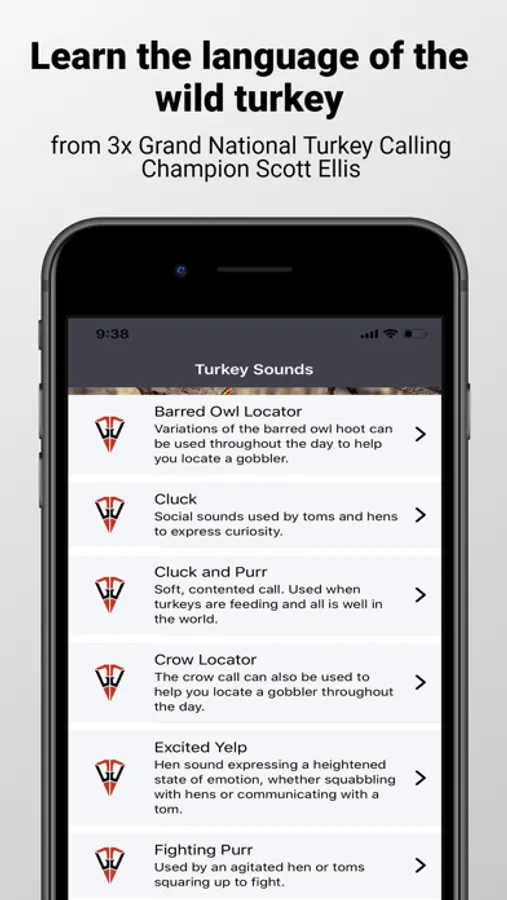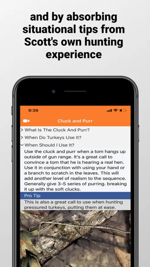 Calls featured on the app (all with how-to video, real turkey audio, and hunting tips for each, including special “Pro Tips”):